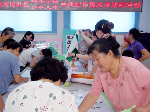 2011年7月底至10月初,通州区妇联联合区纪委举办“廉政进家庭”活动,活动将通过阅读、巧手制作等形式对广大领导干部家庭进行廉政教育。8月12日一大早,通州区中仓街道运河园社区内欢天喜地,小布头、彩纸、报纸、谷物等家中废弃之物汇聚一堂,正在过暑假的青少年、家庭主妇们都来到了这里,参加中仓街道妇联组织的“巧手主妇、少年儿童共同制作廉政装饰画”活动。小朋友和主妇们奇思妙想,有小米做的小老鼠、废布头做的荷花、报纸做的手铐……她们赋予了身边这些废旧垃圾新的生命。制作成的廉政宣传品、宣传画将在评比之后在社区楼门内展出。