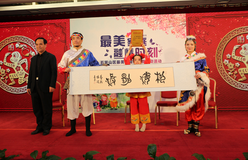1月16日,石景山区妇联举办石景山区“最美家庭”揭晓暨启动活动。活动当天,评出的2015年210户石景山区“最美家庭”齐聚一堂,展示各自家庭的风采。市区领导为4户“最美家庭”代表颁发了荣誉证书,并赠送了书法作品。