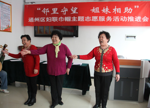 “邻里守望·姐妹相助”巾帼主题志愿服务活动是通州区妇联推动的贯穿2016年的系列活动,旨在进一步推动巾帼志愿服务活动创新发展,引领广大妇女在参与巾帼志愿服务中提高思想修养,在奉献友爱中增进幸福感,在共享发展中推动社会文明程度提高。葛北社区开展的“邻里守望 姐妹乐吧”活动形式十分新颖,在姐妹间开展读书、互帮、互助等活动,有利于塑造安稳幸福生活、促进家庭与社区和谐。在会上,《老姐妹聊乐吧》的柳琴表演唱也将会场的气氛推向高潮。