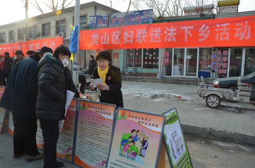 为增强广大农村妇女儿童的法律意识和法制观念,营造祥和稳定的节日法治氛围,1月27日上午,房山区妇联联合区司法局、食药监局、环保局等单位集中在张坊镇大集开展春节前“送法下乡”活动。