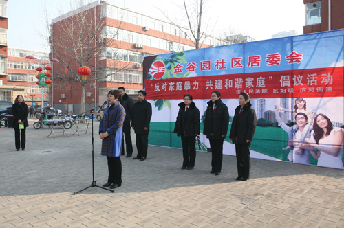 为杜绝家庭暴力,切实维护妇女儿童合法权益,平谷区妇联联合区人民法院、滨河街道在滨河街道金谷园社区举行以“建设法治中国·巾帼在行动——送法进社区、进家庭、到身边”为主题的“三八”维权活动启动仪式。区人民法院、区妇联、滨河街道相关领导出席活动。
