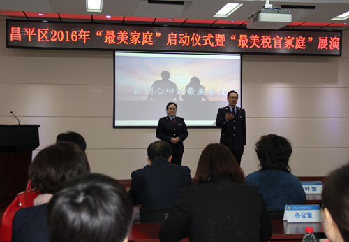 3月7号,昌平区妇联、区国税局共同举办昌平区2016“最美家庭”启动仪式暨“最美税官家庭”展演活动。区妇联主席石东琨、区国税局局长叶放等领导出席,“最美税官家庭”代表和国税局干部100余人参加了活动。
