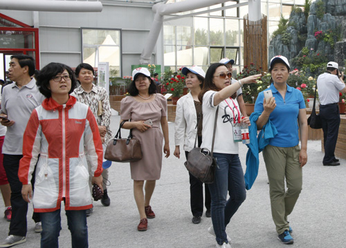 当天下午,大家跟随讲解员的脚步,先后参观了月季会展中心和月季主题园。在月季会展中心内,各国月季争相绽放,布景造型奇妙,色彩瑰丽。特别是走到品种稀有的绿色月季展区和月季创意展厅,大家都不禁驻足,纷纷用相机记录这美好的时光。