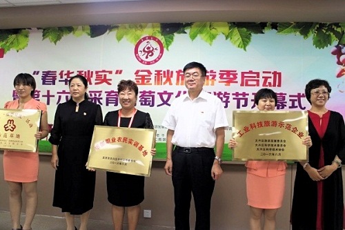 8月18日上午,2016年大兴“春华秋实”金秋旅游季以第十六届采育葡萄文化旅游节开幕为契机,在采育镇宜生源园区正式启动。启动式上,大兴区妇联党组书记、主席、区“双学双比”竞赛活动协调领导小组副组长张伟为北京宜生源食品有限公司授予了“双学双比”示范基地奖牌。