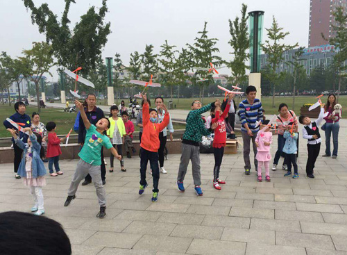 活动开始前先带领孩子和家长做小蝌蚪找妈妈、好玩的大力士、快乐贴贴、螃蟹夹球、福娃跳圈等热身游戏锻炼孩子的应变、协调能力和动手、动脑能力,带动现场活跃气氛,同时增加亲子感情。随后通过物理小实验带领大家了解伯努利原理、弹性原理、作用力与反作用力原理,并制作了滑翔机、弹弓、气球直升机。孩子们和家长一边探索、一边学习,在轻松愉悦的环境下学习科学技能,收获成功的喜悦。