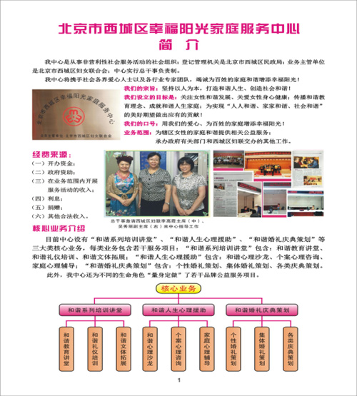 幸福阳光家庭服务中心自成立以来,在区妇联的支持、帮助下,一直从事恋爱、婚姻、家庭和人生和谐的教育研究、教育产品开发以及具体指导工作,曾为政府、各级工青妇组织、企事业单位工会策划举办过多场围绕家庭建设,以“和谐”为主题的丰富多彩的活动,普遍受到好评。