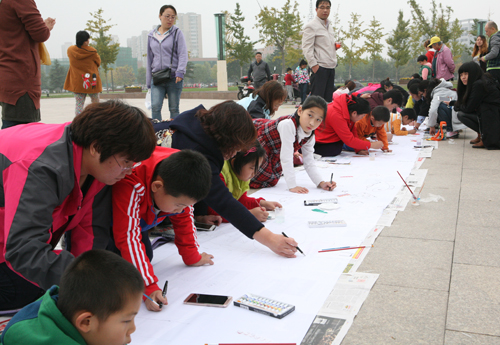 在世纪广场70个孩子与家长拿着彩笔在画布上共同绘制美丽家园或是各种需要共同监督抵制的污染环境的行为。