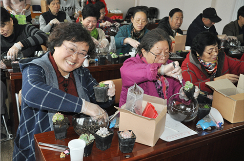 此次培训,特邀丰台花园艺雅苑巧娘工作室的老师进行授课。老师首先向大家介绍了多肉植物的种类、适宜的环境、养护方法等基本知识,大家听的非常认真并做了笔记。接下来就是大家最喜欢的环节,自己动手组合种植多肉植物。按照老师的教学步骤,大家分别对多肉植物进行整理根部、搭配组盆、安放漏网、填土种植、铺面装饰,将各种不同的多肉植物组合搭配在一起。大家边做边交流,并与指导老师一起探讨方法,经过巧娘们的精心设计,一盆盆造型精致、充满春天气息的盆景呈现在眼前,大家看着自己劳动成果喜笑颜开。