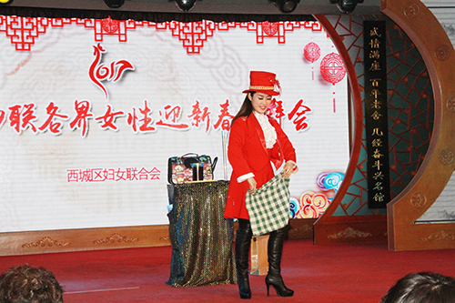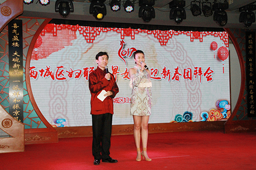 团拜会上,由西城区妇联新希望歌友会合唱的《夕阳红》、《共筑中国梦》拉开序幕。随后的独唱、山东快书、相声、含灯大鼓、杂技魔术等一个个精彩的节目为节日增添浓浓的喜庆气氛。期间穿插的关于区情知识和习近平总书记讲话要点的抢答题更让现场充满了欢乐,大家在活动中学知识、叙友谊,感受到了浓厚的节日氛围和姐妹亲情。