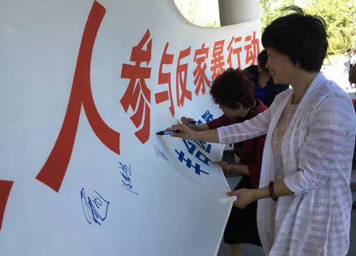 近日,区妇联在园博园针对《关于落实<中华人民共和国反家庭暴力法>的实施意见》文件进行了重点宣传。活动现场气氛热烈,近千名游园群众热情高涨、积极参与,在“人人参与反家暴行动 家家共享平安家庭”签名板上郑重地写下自己的名字,表达了为推进反家暴法的实施而不懈努力。宣传活动让“反家暴”真正从条款走进生活,以实际行动维护弱势群体的合法权益,让更多的妇女群众受益于法。
