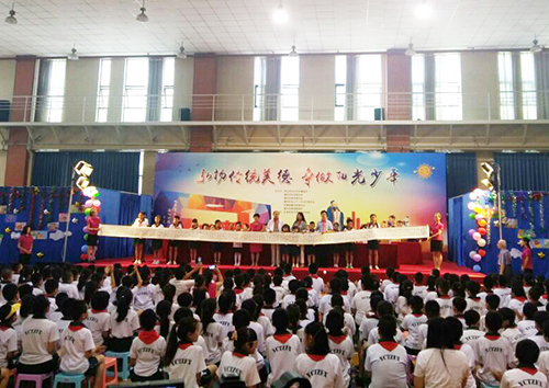 活动中,北京高占祥文化艺术基金会不仅向北京育才学校通州分校赠送了“阳光与少年”启蒙教育丛书,还赠送了高占祥老人亲笔书写的“新三字经”长卷,并向学校获得“阳光少年”称号的同学们颁发了“阳光少年”徽章。高占祥在讲话中表达了对老家通州孩子们精神生活的关爱,并希望学校能够在今后积极开展“阳光少年”活动,通过多种形式加强思想道德教育,实现“立德树人”的教育目标。高占祥还现场领诵了《新三字经》的一段内容,台下的同学们呼应齐诵、场面热烈,充满着孩子们的朝气和阳光。