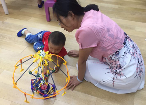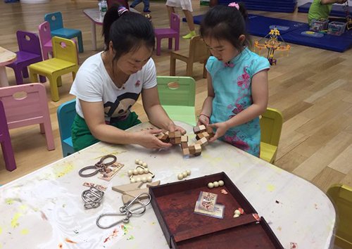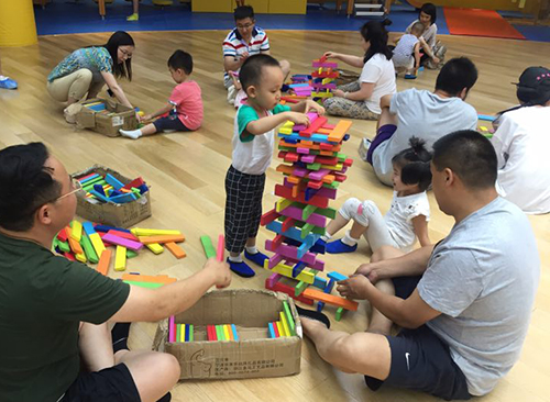 在宽阔的场地中央,五个小桌上摆放着各种既要动手又要动脑的玩具,孩子和家长围坐一圈,认真、仔细地研究着、摸索着、尝试着解决玩具出的难题。在小桌子周围还有其他益智玩具,有迷你3D打印机,可打出各种小动物;有卡普乐,可搭建魔塔。小朋友与家长一起搭建的近1.7米高的魔塔引得大家纷纷拍照留念,小朋友爬上爬下,玩得不亦乐乎。