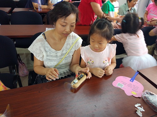 讲座后,进行了亲子互动活动,一个小刷子、一个小马达、一节电池和一个棉签,在老师的指导下,家长和孩子们用他们灵巧的双手制作出会跑的“刷刷车”。在制作过程中,父母和孩子互帮互助,既增加了亲子交流互动频率,也锻炼了孩子们的动手能力。在手工制作活动过后,家长们也纷纷表示这样的活动切实促进了亲子关系的建立,以后也会多多与孩子进行互动和交流,巩固与孩子的亲子关系。