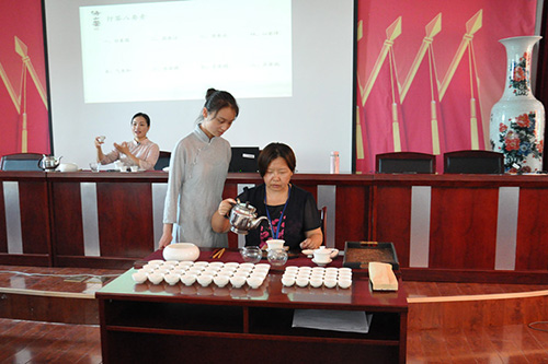 活动特邀倚山堂孔子茶道院院长杜合菊老师为大家授课,讲授孔子茶礼、茶道文化。在近2小时的课程中,杜老师向大家介绍茶盂、茶夹、品茗杯等茶具,阐述了茶叶种类、茶艺礼仪等理论知识,然后按照泡茶的步骤演示和指导大家亲手烧水、冲洗茶具、洗茶、如何泡制种类不同的茶叶。接着,学员们按照老师教授的步骤,开始自己动手泡茶,进行了扎实的实践训练,课堂上洋溢着袅袅茶香。