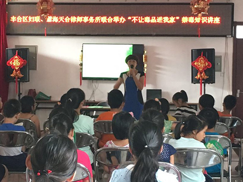 为了进一步动员和组织广大妇女群众参与禁毒斗争,推进“平安家庭”创建工作,使平安禁毒宣传活动深入社区、走进家庭、融入人心,共同构筑全区群防群控的平安禁毒宣传工作新格局,2017年,丰台区妇联切实加强了对禁毒宣传工作的领导,加大禁毒宣传工作力度,将禁毒宣传工作纳入了妇联全年工作计划中。区妇联作为区禁毒委成员单位,积极发挥职能作用,采取措施不断深化“不让毒品进我家”禁毒宣传活动,与慧海天合律师事务所联合开展“不让毒品进我家”禁毒知识宣传讲座,面向妇女以及家庭成员,依托“平安家庭”、“妇女之家”等阵地广泛开展禁毒宣讲活动,引导带动广大妇女群众开展禁毒家庭预防教育,不断提升广大妇女和家庭成员识毒、防毒、拒毒的意识,有效推动了我区禁毒工作的开展。