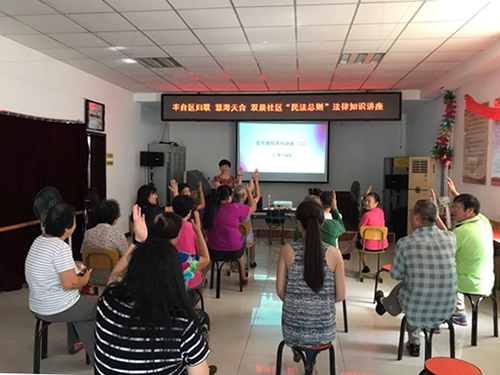 十二届全国人大五次会议审议通过了《民法总则》,并将于2017年10月1日起正式实施。为了让社区居民了解与生活息息相关的民法总则,丰台区妇联组织普法宣传进社区活动。为了方便大家在以后遇到法律问题时有正确的认识和处理方式,最大程度维护自身权益,讲座内容涉及了胎儿民事权利能力的保护、限制民事行为能力人年龄改为8周岁、被监护人“自我决定权”和“正常化”、个人信息虚拟财产受保护的规定等几个方面。老师通过案例的讲解和现场互动,让居民了解了《民法总则》的相关规定,教老百姓运用法律武器保护自己的合法权益。