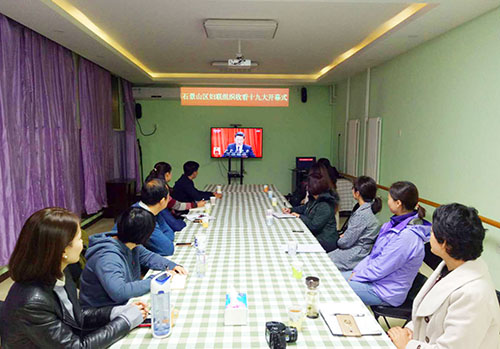 为深入学习宣传贯彻党的十九大精神,团结和引导广大妇女群众以更加饱满的热情投身首都妇女儿童事业,石景山区妇联积极部署,10月18日上午组织大家收看了十九大开幕会及习近平总书记重要讲话,并组织与会人员进行座谈讨论。区妇联全体党员干部职工、基层妇女干部、妇女之家负责人等针对报告进行了热烈讨论,纷纷表示要在学习贯彻党的十九大精神上立足本职工作,敢于创新,结合实际工作,把学习贯彻党的十九大精神转化为服务大局、服务妇女、服务基层的实际行动,最大限度地发挥好妇联在组织妇女、引导妇女、服务妇女、维护妇女合法权益中的优势和作用,推动妇联工作上新台阶。