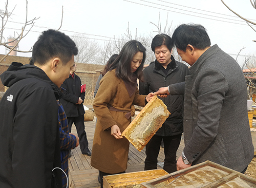 慰问组一行首先来到北京野馨科技发展有限公司慰问负责人赵丽梅。野馨科技公司和平谷区养蜂协会联手服务平谷区养蜂户250余户,为他们提供技术培训、发放蜂具、产品收购、终端销售等一条龙服务。该公司拥有金海湖商标,产品已成功加入北京市第一批“食用林产品安全信息追溯”项目,实现了消费者对“金海湖”蜂产品品质的追溯和监督。赵丽君等领导对该公司打造的集科普、旅游、餐饮为一体的蜜蜂文化乐园进行了现场观摩,详细了解其线上线下相结合的销售模式,鼓励其在不断发展的同时带动更多姐妹共同致富。