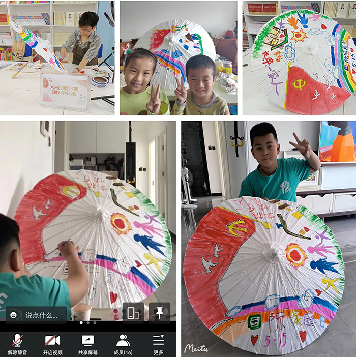 本周是《中华人民共和国家庭教育促进法》施行后的首个全国家庭教育宣传周,为进一步深入贯彻落实习近平总书记关于注重家庭家教家风建设重要论述精神,深化家庭文明建设,在5.15国际家庭日来临之际,大兴区妇联与榆垡镇妇联共同举办大兴区家庭文明建设系列活动——“爱与陪伴”创意手工手绘油纸伞线上活动,共计15组亲子家庭参与。
