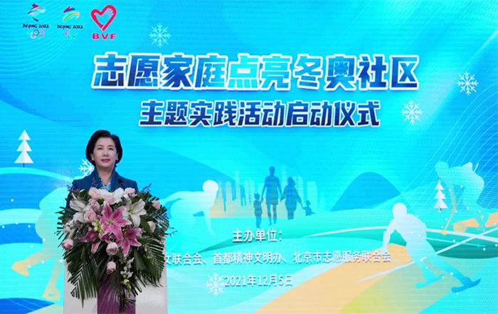 为深入推进2022冬奥会冬残奥会城市志愿服务工作,12月5日,由北京市妇联、首都精神文明办、北京市志愿服务联合会共同主办的“志愿家庭点亮冬奥社区”主题实践活动在线上正式启动。市委宣传部副部长、首都精神文明办主任、北京2022年冬奥会和冬残奥会组织委员会志愿者部部长滕盛萍,北京市妇联党组书记、主席张雅君,北京市志愿服务联合会副会长兼秘书长李健,北京市妇联党组成员、副主席陈延平出席活动。